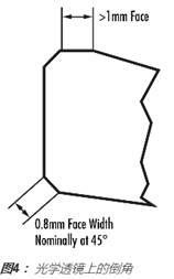 倒角的*常見(jiàn)切割角度為45°,并且該表面寬度是由光學(xué)產(chǎn)品的直徑來(lái)確定的。 其直徑小于3.00mm的光學(xué)產(chǎn)品(如微透鏡或微棱鏡)通常不需要切成倒角,這是因?yàn)楹芸赡軙?huì)在切削的過(guò)程中產(chǎn)生邊緣缺口。值得注意的是,對(duì)于很小的曲率半徑,例如,當(dāng)透鏡的直徑大于等于0.85 x曲率半徑時(shí),無(wú)需切成倒角,這是因?yàn)橥哥R表面和邊緣之間會(huì)形成很大的角度。對(duì)于所有其他直徑,表1提供了*大的表面寬度。