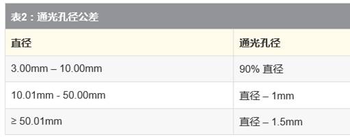 通光孔徑是指光學(xué)元件的直徑或必須滿足各種規(guī)格的光學(xué)元件的尺寸。除通光孔徑以外,制造商并不能確保光學(xué)產(chǎn)品符合指定的規(guī)格。由于生產(chǎn)的限制,實(shí)際上是不可能生產(chǎn)出完全等同于光學(xué)產(chǎn)品的直徑或長(zhǎng)乘以寬的通光孔徑。表2顯示了透鏡的一般通光孔徑。