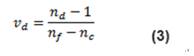 玻璃的另一種材料屬性是色散系數(shù),用于量化玻璃呈現(xiàn)的色散量。它是材料在f (486.1nm)、d (587.6nm) 和c (656.3nm)波長(zhǎng)時(shí)的折射率(方程式3)。