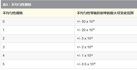 某種介質(zhì)的折射率是指光在真空中的速度與光在介質(zhì)中的速度之比。玻璃的折射率范圍一般在1.4-4.0之間,與針對(duì)紅外線優(yōu)化的玻璃相比,可視玻璃的折射率范圍要小一些。例如,N-BK7(一種通用的可視玻璃)的折射率為1.517,然而鍺(一種通用的紅外玻璃)的折射率為4.003。有關(guān)紅外材料的更多信息,請(qǐng)參閱“紅外 (IR) 應(yīng)用領(lǐng)域使用的正確材料”。光學(xué)玻璃的折射率是一種重要屬性,因?yàn)楣鈱W(xué)表面的功率是從表面的曲率半徑和表面任意一側(cè)上的介質(zhì)折射率之差得來(lái)的。玻璃制造商指定的不均勻性是指玻璃折射率的變化。不均勻性是根據(jù)不同的等級(jí)來(lái)指定的,其中等級(jí)和不均勻性是互為相反關(guān)系的,隨著等級(jí)的增加,不均勻性則會(huì)減少(表3)。
