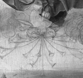 圖 4b: 相比較畫中實(shí)際所畫的5個(gè)喇叭,可以看到近紅外成像中有10個(gè)喇叭在大天使之下。畫中喇叭的位置似乎需要一個(gè)重新定位的帆船。地球儀上的腳趾的位置也與原始草圖的位置不同。圖像版權(quán)所有 by Detroit Institute of Arts。經(jīng)允許使用。