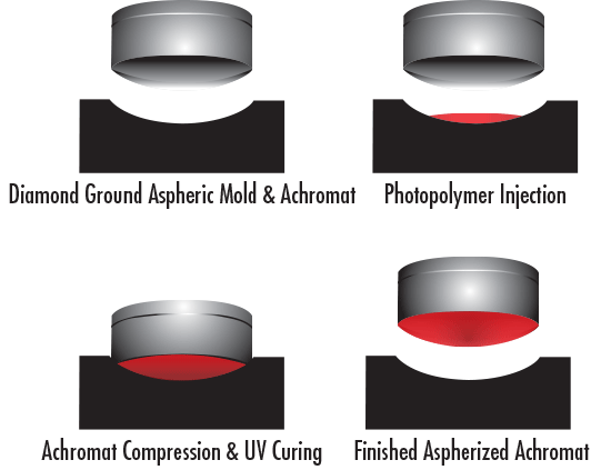 混合成型,以如消色差透鏡的一個(gè)標(biāo)準(zhǔn)球面表面為基底,通過(guò)包含了一薄層光敏聚合物的非球面模造,將該球面表面壓鑄成型,*終生產(chǎn)出一個(gè)非球面表面。這項(xiàng)技術(shù)采用一個(gè)鉆石磨砂非球面模造和一個(gè)玻璃消色差透鏡(雖然也可以使用其他類(lèi)型的單片透鏡和雙合透鏡),在非球面模造內(nèi)注入光敏聚合物,再讓非球面模造將球面表面壓鑄成型。*后,此技術(shù)通過(guò)在室溫壓縮和UV固化這兩個(gè)表面,產(chǎn)生一個(gè)非球面消色差透鏡。該透鏡的光學(xué)屬性結(jié)合了其所組成部件分別所展示的光學(xué)屬性:消色和球面像差校正。圖7為混合透鏡的制作過(guò)程?;旌铣尚头浅_m用于高批量高精密的應(yīng)用,這些場(chǎng)合除了需要極高性能之外,也可以通過(guò)批量生產(chǎn)所獲得的成本節(jié)約抵消其高初始工具成本。更多有關(guān)使用混合流程制作非球面消色差透鏡的信息,請(qǐng)參閱為什么使用消色差透鏡?。
