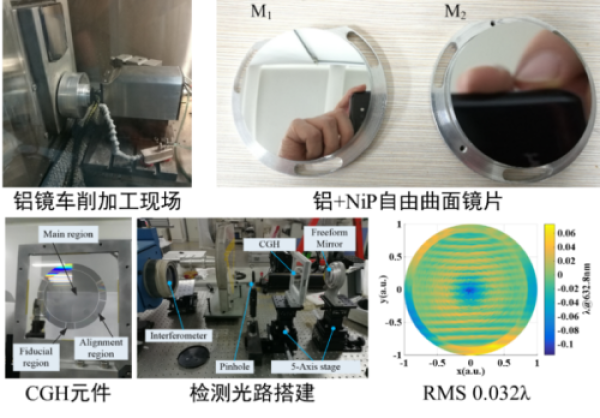 由于自由曲面技術(shù)各環(huán)節(jié)之間的相互關(guān)聯(lián)性,中國科學(xué)院西安光學(xué)精密機(jī)械研究所空間光子信息新技術(shù)研究室自由曲面技術(shù)研究團(tuán)隊(duì),就自由曲面理論、設(shè)計(jì)、加工、檢測等方面開展了系統(tǒng)研究,突破了可見光波段自由曲面的多參量高效優(yōu)化設(shè)計(jì)、高精度零位補(bǔ)償干涉檢測及超精密迭代補(bǔ)償加工等關(guān)鍵技術(shù),研制出新型“低成本、可快速響應(yīng)、全鋁光機(jī)、全自由曲面”大視場可見光相機(jī),鋁基自由曲面(7階以上XY多項(xiàng)式)制造精度達(dá)到國際先進(jìn)水平~RMS1/30λ@632.8nm,相機(jī)視場角20°×15°、實(shí)測傳函~0.4@78lp/mm。此外,科研人員研制出多款全鋁光機(jī)全自由曲面大視場非制冷和制冷紅外相機(jī),并獲得優(yōu)異的成像質(zhì)量。隨著自由曲面技術(shù)的快速發(fā)展,未來該技術(shù)有望為光電空天領(lǐng)域等新型顛覆性光學(xué)系統(tǒng)的研制提供重要支撐。