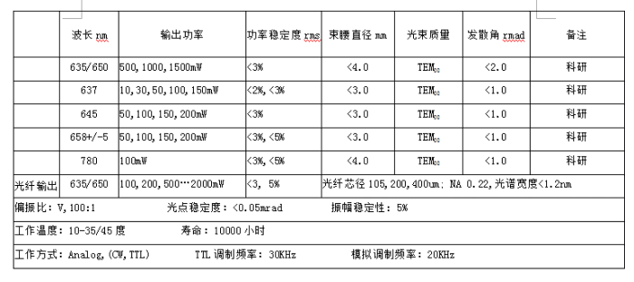 注:不同波長和功率的激光器價(jià)格也是不同,歡迎可以對照下面的參數(shù)表咨詢客服。