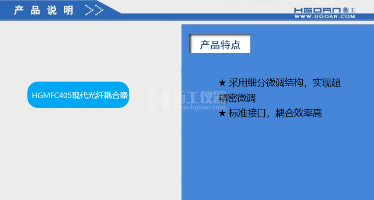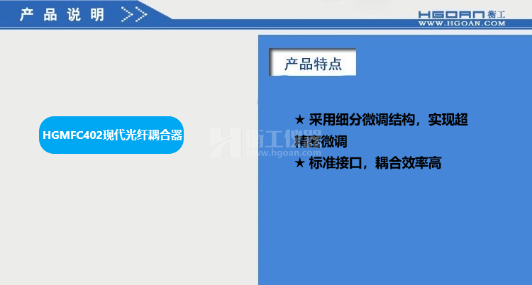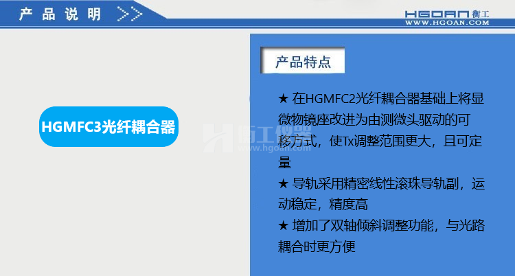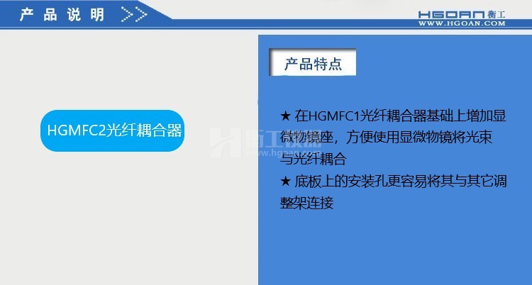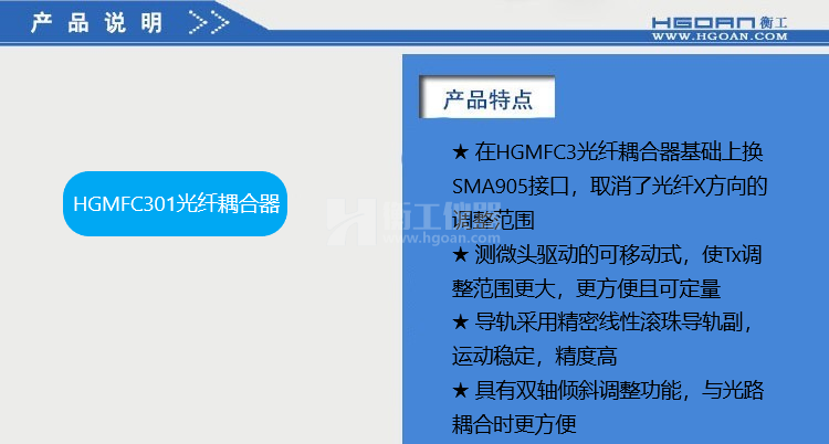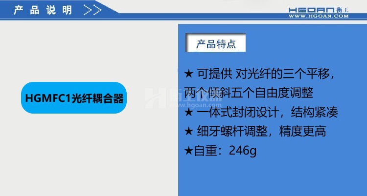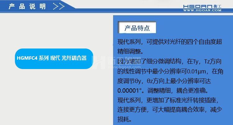 ★HGMFC系列光纖耦合器可提供對光纖的五個(gè)自由度調(diào)整,能快速精確地完成耦合,獲得最佳耦合效果;